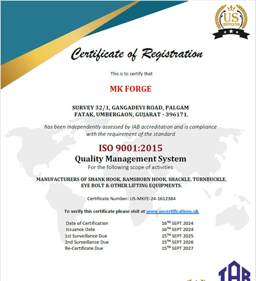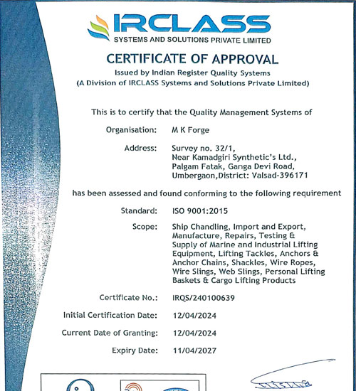 These certifications as below, ensure that MK Forge products are manufactured with high safety standards, material traceability, and quality assurance — all critical for the performance and reliability of lifting equipment.