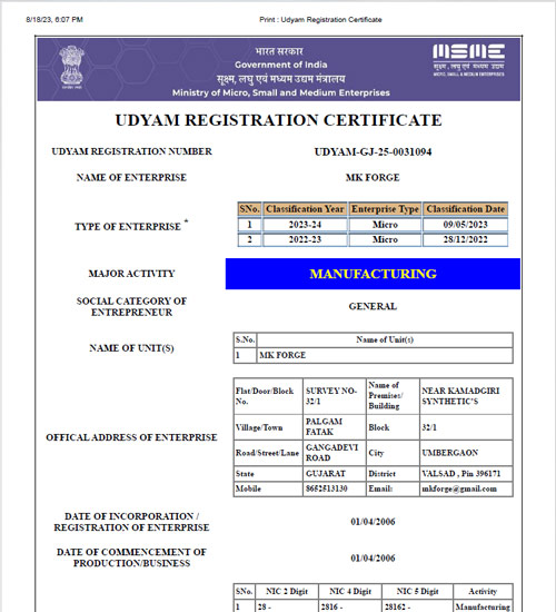 M.K.Forge is an approved vendor of government sector and companies like Indian Railway, Bhel, BEML, NMDC Mahatransco, MCGM, Mazgaon Dock etc and still trying to grow business in the global market. We have been planning to grow in same lines and ensure bright future. We are even planning to implement the prestigious ISO 9001:2015 certification. We also think that government should help Small Scale industries to grow. Our firm has received various award from prestigious association and organisations. Our firm has its customer base, all around the nation.