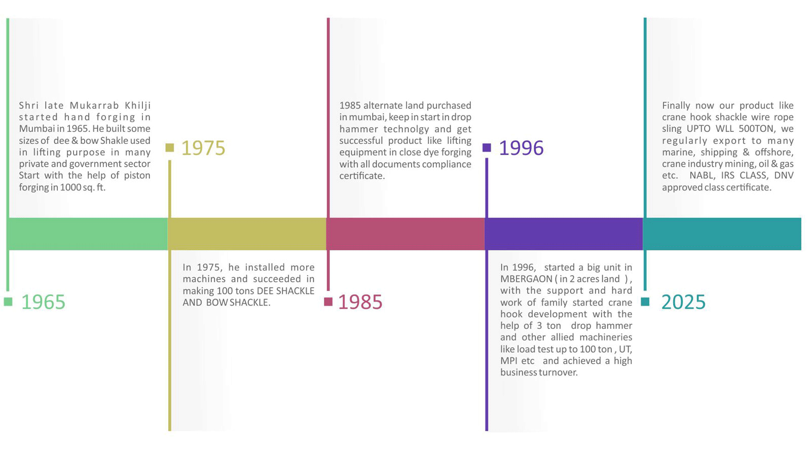Mr. late Shri Mukarab Khilji was the founder of M. K. Forge in the year 1965; having experience in the field of CRANE HOOK RAMSHORN HOOK UPTO WLL 50O TON CAPACITY, lifting tackles, transmission line, container lashing, and closed die forging.