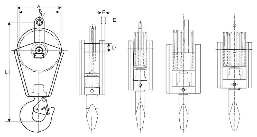 High-strength fabricated steel frames. Forged alloy steel hooks and sheaves. Wear-resistant sheave linings (optional).